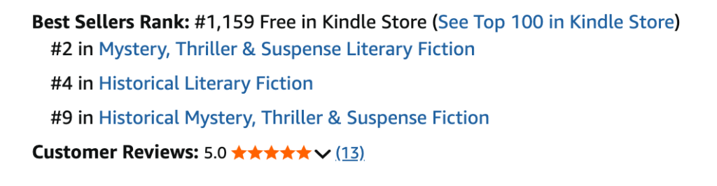I’m #2 in Mystery, Thriller & Suspense Literary Fiction, #4 in Historical Literary Fiction, and #9 in Historical Mystery, Thriller & Suspense Fiction.